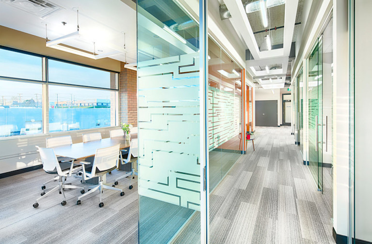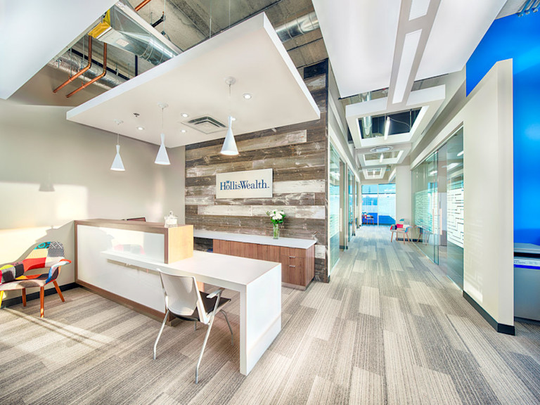 Located on the second floor of Northfield Station in Waterloo, Hollis Wealth is a 1,900 square foot interior fit-out project for this wealth and financial management firm. Together with interior designer Adah Trabulsi of Dfy Studio Ltd., Zehr Levesque created a modern office space complete with open reception area, kitchenette, glass-enclosed offices, and a large boardroom. The reception space features an eye-catching barnboard wall and the glazing stands out with intricate glazing graphics.