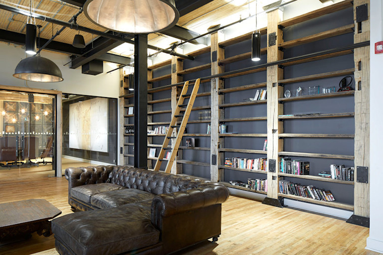 One of the key projects involved a 30,000 square foot, three-storey tenant fit-out at 8 Queen Street, where our team transformed the historic building into a dynamic workplace reflecting Vidyard’s distinctive brand and culture. The space features a raw, industrial design aesthetic with exposed brick and structure, alongside unique elements such as a large meeting room constructed from two shipping containers, metal coil room partitions, and a library space with full-height bookshelves and sliding ladders.