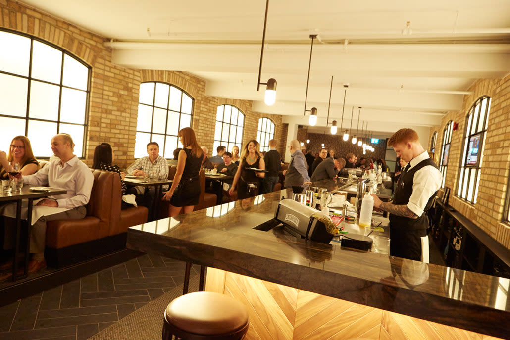 Located on the lower level of The Walper Hotel, TWH Social is a renovation to the existing Rum Runner Pub in downtown Kitchener. This Bar and Bistro is a welcome addition to downtown with a 46 foot custom millwork bar, inviting dining room with antiqued mirror feature wall, and a party room large enough to host any dinner party or lunch meeting. Design features are showcased throughout the space including exposed reclaimed brick walls, intricate tile flooring and a custom wine display in the Pub’s original bank vault. TWH Social is a new, modern Bar and Bistro, which pays tribute to the rich history of The Walper Hotel.